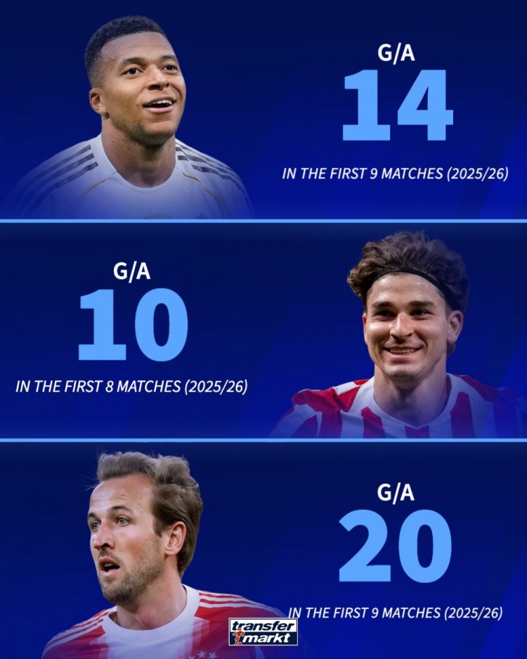 Thị trường chuyển nhượng Đức liệt kê dữ liệu tấn công của Kane, Mbappe và Alvarez, so sánh ba dữ liệu.