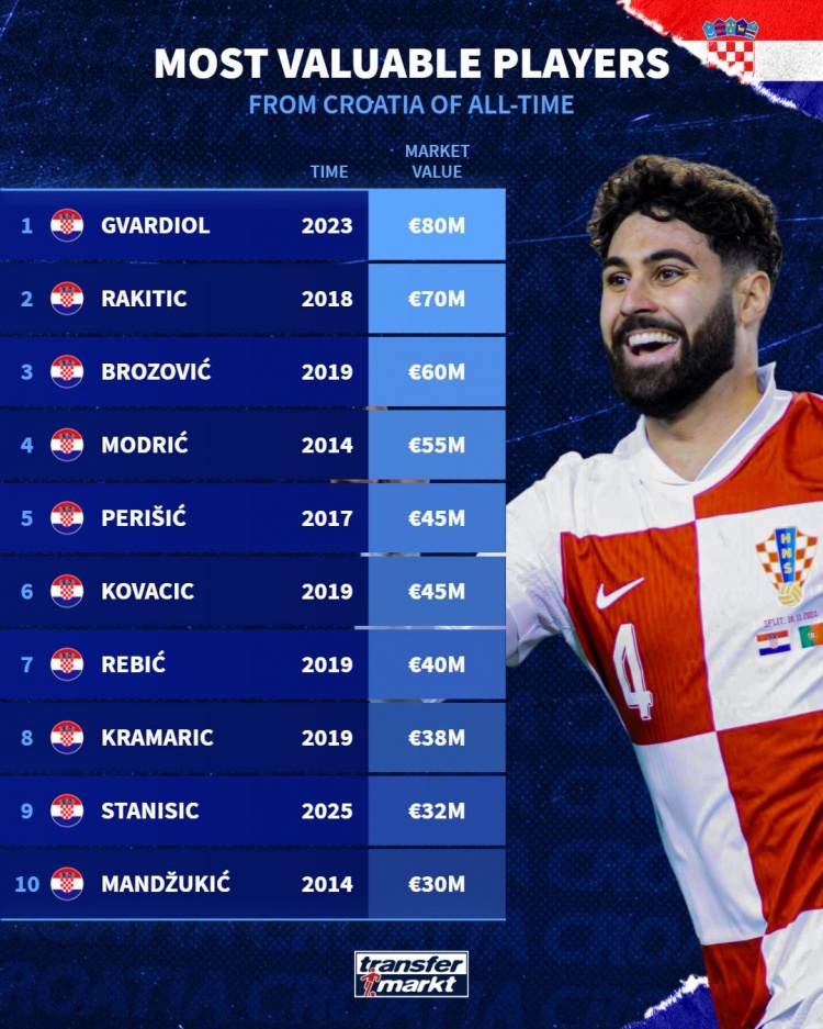 Thị trường chuyển nhượng Đức đã tính toán giá trị lịch sử cao nhất của các cầu thủ Croatia và liệt kê bảng xếp hạng giá trị lịch sử của các cầu thủ Croatia. Gvardiol đứng đầu danh sách với 80 triệu euro.